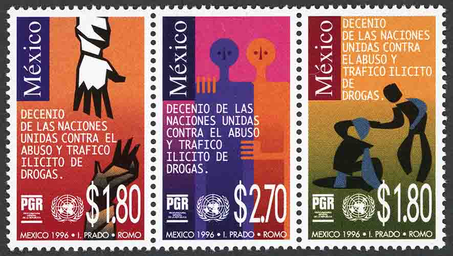 No. Scott: 1984a-c -- Año de Emisión: 1996 -- $1.80 $ 2.70 -- Multicolor -- Perforación: 13 1/2 -- Tipo de Impresión: Offset Tira de tres Timbres Mexicanos multicolor, con ilustraciones surrealistas, en el primer timbre aparecen dos manos, en el segundo hay dos siluetas humanas y en el tercero hay dos contornos mostrando ayuda, en cada estampilla está escrito "MEXICO", "DECENIO DE LAS NACIONES UNIDAS CONTRA EL ABUSO Y TRÁFICO ILÍCITO DE DROGAS", el valor facial y "MEXICO 1996, I. PRADO, ROMO". Para más información favor de dirigirse a biblioteca@mufi.org.mx