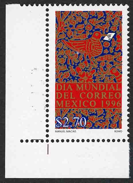No. Scott: 1996 -- Año de Emisión: 1996 -- $ 2.70 -- Multicolor -- Perforación: 13 1/2 -- Tipo de Impresión: Offset Timbre Postal Mexicano con margen izquierdo e inferior en colores oro, rojo y azul, al fondo de la imagen aparece un mozaico de diferentes animales, resalta una paloma sosteniendo un sobre con el pico, sobre la estampilla está escrito "DÍA MUNDIAL DEL CORREO EN MÉXICO", el valor facial de "$ 2.70" y "MANUEL MACÍAS, ROMO". Para más información favor de dirigirse a biblioteca@mufi.org.mx