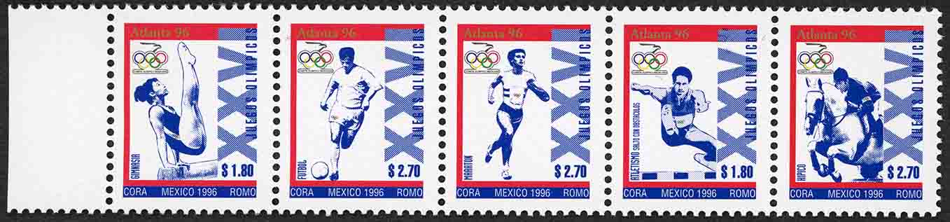Tira de Cinco Timbres Alusivos a los Juegos Olímpicos Atlanta 96 -- Sin Marca de Agua -- Offset -- Perforación -- Un Peso con Ochenta Centavos,Dos Pesos con Setenta Centavos -- Multicolor