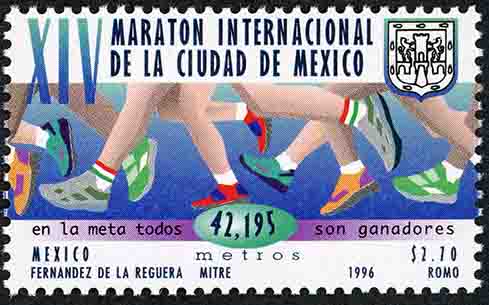 No. Scott: 1989 -- Año de Emisión: 1996 -- $ 1.80 y $ 2.70 -- Multicolor -- Perforación: 13 1/2 -- Tipo de Impresión: Offset Timbre Postal Mexicano multicolor, en la imagen se observan numerosos pies de corredores, portando difrente calzado deportivo, en la parte superior está escrito"XIV MARATÓN INTERNACIONAL DE LA CIUDAD DE MÉXICO", "en la meta todos son ganadores", "42,195 metros", "MÉXICO", el valor facial de "$ 2.70" y "FERNÁNDEZ DE LA REGUERA MITRE, 1996, ROMO". Para más información favor de dirigirse a biblioteca@mufi.org.mx