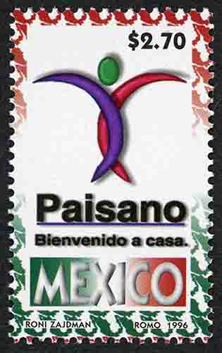 No. Scott: 2008 -- Año de Emisión: 1996 -- $ 2.70 -- Multicolor -- Perforación: 13 1/2 -- Tipo de Impresión: Offset Fluorescente Timbre Postal Mexicano multicolor, en la imagen aparecen dos líneas curvas entrelazadas y un óvalo en medio de éstas, en la parte superior está escrito el valor facial de "$ 2.70", en la parte inferior "Paisano, Bienvenido a casa", "MEXICO" y "RONI ZAJDMAN, ROMO 1996" Para más información favor de dirigirse a biblioteca@mufi.org.mx