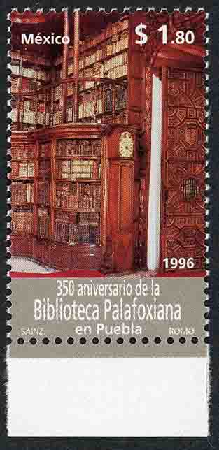 No. Scott: 2013 -- Año de Emisión: 1996 -- $ 1.80 -- Multicolor -- Perforación: 13 -- Tipo de Impresión: Offset Fluorescente Timbre Postal Mexicano en colores gris y café amarillento, en la imagen se observa parte del interior de la Biblioteca Palafoxiana, ubicada en la Ciudad de Puebla, en la parte superior está escrito "México", el valor facial de "$ 1.80", en la parte inferior "1996" y "350 Aniversario de la Biblioteca Palafoxiana enb Puebla". Para más información favor de dirigirse a biblioteca@mufi.org.mx
