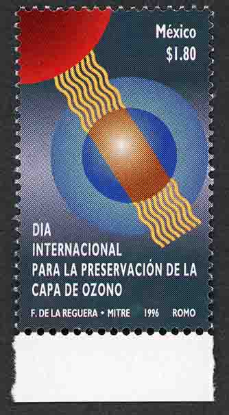 No. Scott: 2015 -- Año de Emisión: 1996 -- $ 1.80 -- Multicolor -- Perforación: 13 1/2 -- Tipo de Impresión: Offset Fluorescente Timbre Postal Mexicano multicolor, en la imagen aparece una representación gráfica del ozono en el espacio, entre el sol y la tierra, en la parte superior está escrito "México", el valor facial de "$ 1.80", en la parte inferior "DIA INTERNACUIONAL PARA LA PRESERVACIÓN DE LA CAPA DE OZONO" y "F. DE LA REGUERA, MITRE, 1996, ROMO". Para más información favor de dirigirse a biblioteca@mufi.org.mx