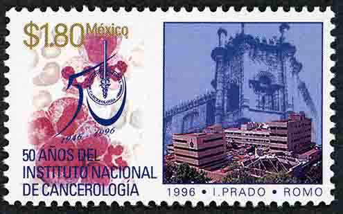 No. Scott: 2007 -- Año de Emisión: 1996 -- $ 1.80 -- Multicolor -- Perforación: 13 1/2 -- Tipo de Impresión: Offset Fluorescente Timbre Postal Mexicano multicolor, del lado izquierdo aparece el emblema del Instituto Nacional de Cancerología, del lado derecho se observa el antiguo y nuevo edificio de la Institución, sobre la estampilla está escrito el valor facial, la palabra "MÉXICO", "50 AÑOS DEL INSTITUTO NACIONAL DE CANCEROLOGÍA " y "1996, PRADO, ROMO". Para más información favor de dirigirse a biblioteca@mufi.org.mx