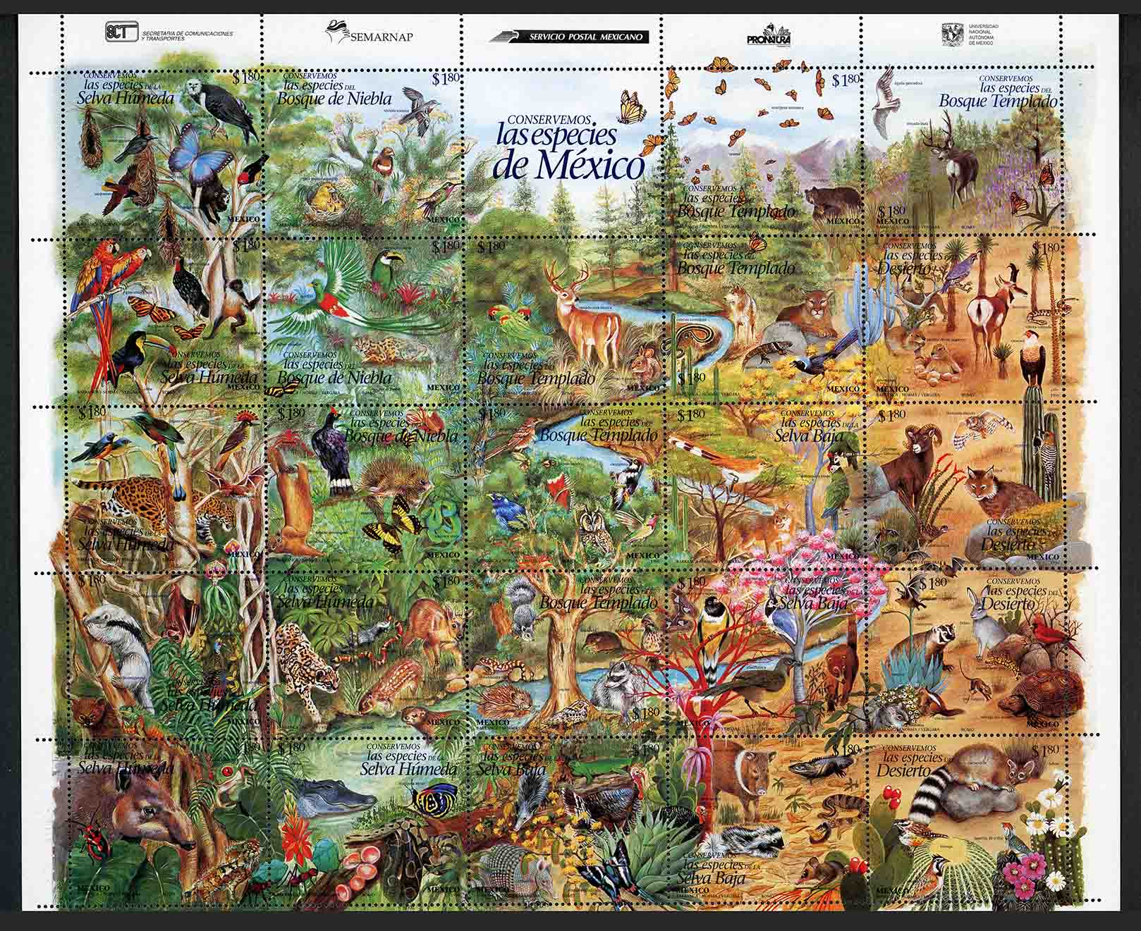 No. Scott: 1995 -- Año de Emisión: 1996 -- $ 24.00 -- Multicolopr -- Perforación: 13 1/2 -- Tipo de Impresión: Offset Hoja completa con veinticuatro Timbres Postales de México más etiqueta, cada timbre nos muetra diferentes animales o vegetales, mismos que se mencionan con su nombre, también muestra las distintas zonas climatológicas de México como son: Bosque Templado, Bosque de Niebla, Desierto, Selva Húmeda y Selva Baja, así mismo aparece el valor facial en cada estampilla. Para más información favor de dirigirse a biblioteca@mufi.org.mx