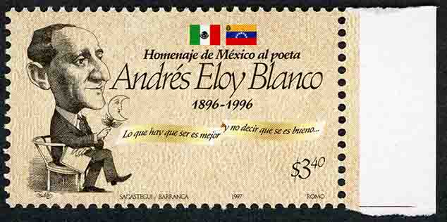 No. Scott: 2019 -- Año de Emisión: 1997 -- $ 1.80 -- Multicolopr -- Perforación: 13 1/2 -- Tipo de Impresión: Offset Fluorescente Timbre Postal Mexicano multicolor, en la imagen aparece la caricatura del poeta Venezolano Andrés Blanco, él permanece sentado, con ñas piernas cruzadas, en una mano sostiene un libro y en la otra una media luna, en la parte superior se observan las banderas de México y Venezuela, también está escrito "Homenaje de México al poeta Andrés Eloy Blanco 1896-1996", "Lo que ser es mejor y no decir que se es bueno..." y "SAGASTEGUI / BARRANCA, 1997 ROMO". Para más información favor de dirigirse a biblioteca@mufi.org.mx