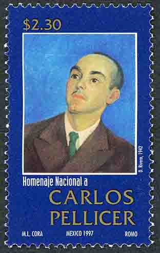 No. Scott: 2018 -- Año de Emisión: 1997 -- $ 2.30 -- Azul, sepia, café y oro -- Perforación: 13 1/2 -- Tipo de Impresión: Offset Fluorescente Timbre Postal Mexicano en colores azul, sepia, café y oro, en la imagen se observa el retrato del escritor y poeta mexicano Carlos Pellicer, obra realizada por Diego Rivera, sobre la estampilla está escrito el valor facial de "$ 2.30", "Homenaje Nacional a CARLOS PELLICER" y "M. L. CORA, MÉXICO 1997, ROMO". Para más información favor de dirigirse a biblioteca@mufi.org.mx