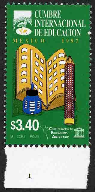 No. Scott: 2020 -- Año de Emisión: 1997 -- $ 3.40 -- Amarillo, azul y sepia -- Perforación: 13 1/2 -- Tipo de Impresión: Offset Fluorescente Timbre Postal Mexicano en colores amarillo, azul y sepia, la imagen muestra una ilustración surrealista, mostrando un cuaderno, un lápiz y un tintero, en la parte superior está escrito "CUMBRE INTERNACIONAL DE EDUCACIÓN, MÉXICO 1997", en la parte inferior el valor facial de "$ 3.40", "CONFEDERACIÓN DE EDUCADORES AMERICANOS" y "M. CORA, ROMO". Para más información favor de dirigirse a biblioteca@mufi.org.mx