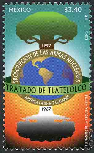 No. Scott: 2021 -- Año de Emisión: 1997 -- $ 3.40 -- Multicolor -- Perforación: 13 1/2 -- Tipo de Impresión: Offset Fluorescente Timbre Postal Mexicano multicolor, la imagen reprersenta una explosión gráfica figurada, representada por un árbol verde y frondoso, un mapamundi y la sombra del árbol, sobre la estampilla está escrtio, "MÉXICO", el valor facial de "$ 3.40", "TRATADO DE TLATELOLCO 1977" y "FERNÁNDEZ DE LA REGUERA, ROMO, 1997". Para más información favor de dirigirse a biblioteca@mufi.org.mx