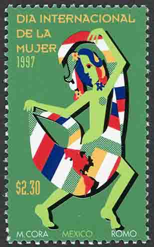 No. Scott: 2029 -- Año de Emisión: 1997 -- $ 2.30 -- Multicolor -- Perforación: 13 1/2 -- Tipo de Impresión: Offset Fluorescente Timbre Postal Mexicano multicolor, en la imagen se observa la figura de una mujer, realizando movimientos cadenciosos, cubierta con un mozaico multicolor, al frente se aprecia el mapa del conmtinente americano, sobre la estampilla está escrito "DÍA INTERNACIONAL DE LA MUJER 1997", el valor facial de "$ 2.30" y "M. CORA, MÉXICO, ROMO". Para más información favor de dirigirse a biblioteca@mufi.org.mx