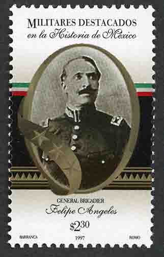 No. Scott: 2026 -- Año de Emisión: 1997 -- $ 2.30 -- Multicolor -- Perforación: 13 1/2 -- Tipo de Impresión: Offset Fluorescente Timbre Postal Mexicano multicolor, en la imagen y dentro de un óvalo, aparece el retrato del General Felipe Ángeles, en la parte superior está escrito "MILITARES DESTACADOS en la Historia de México", en la parte inferior "GENERAL DE DIVISIÓN", el valor facial y "BARRANCA, 1997, ROMO". Para más información favor de dirigirse a biblioteca@mufi.org.mx