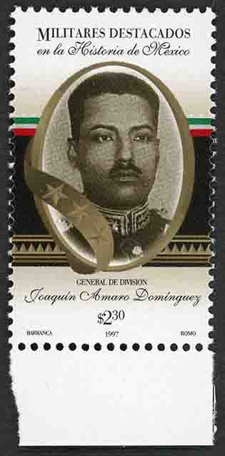 No. Scott: 2028 -- Año de Emisión: 1997 -- $ 2.30 -- Multicolor -- Perforación: 13 1/2 -- Tipo de Impresión: Offset Fluorescente Timbre Postal Mexicano multicolor, en la imagen y dentro de un óvalo, aparece el retrato del General Joaquín Amaro Dominguez, en la parte superior está escrito "MILITARES DESTACADOS en la Historia de México", en la parte inferior "GENERAL DE DIVISIÓN", el valor facial y "BARRANCA, 1997, ROMO". Para más información favor de dirigirse a biblioteca@mufi.org.mx