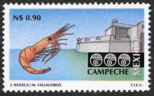 No. Scott: 1782 -- Año de Emisión: 1993 -- Valor Facial: N$ .90 -- Multicolor -- Perforación: 14 x 14 1/4 -- Tipo de Impresión: Huecograbado Timbre Postal Mexicano multicolor, perteneciente a la serie de México Turístico, del lado derecho y al fondo de la imagen se observa el Fuerte de San Miguel, un inmueble muy representativo de la ciudad de Campeche y del lado izquierdo, aparece un animal marino, conocido con el nombre de camarón, sobre la estampilla está escrito el valor facial de N$ .90, "CAMPECHE, MÉXICO" y J. HUESCAS / M. VILLALOBOS, T.I.E.V. Para más información favor de dirigirse a biblioteca@mufi.org.mx