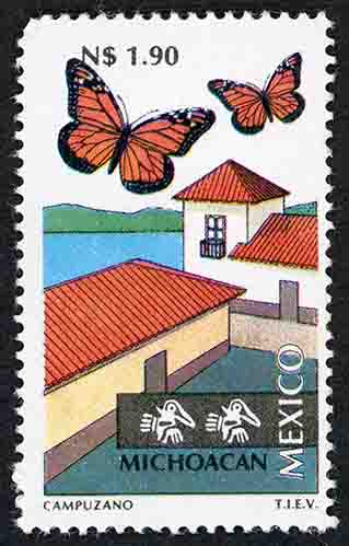 No. Scott: 1790 -- Año de Emisión: 1993 -- Valor Facial: N$ 1.90 -- Multicolor -- Perforación: 14 x 14 1/4 -- Tipo de Impresión: Huecograbado Timbre Postal Mexicano multicolor, perteneciente a la serie de México Turístico, al fondo de la imagen aparece un área verde y otra de agua, en primer plano se observan dos casas con techos de tejas, sobre de estas, hay dos mariposas volando, en la parte superior está escrito el valor facial de "N$ 1.90", en la parte inferior "MICHOACÁN, MÉXICO" y "CAMPUZANO T.I.E.V.". Para más información favor de dirigirse a biblioteca@mufi.org.mx