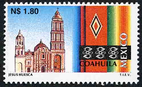 No. Scott: 1786 -- Año de Emisión: 1995 -- Valor Facial: N$ 1.80 -- Multicolor -- Perforación: 14 x 14 1/4 -- Tipo de Impresión: Huecograbado Timbre Postal Mexicano multicolor, perteneciente a la serie de México Turístico, del lado izquierdo de la imagen aparece la fachada de la catedral de Saltillo y del lado derecho se aprecia un textil artesanal de varios colores, sobre la estampilla está escrito el valor facial de "N$ 1.80", "COAHUILA MÉXICO" y "JESÚS HUESCA T.I.E.V.". Para más información favor de dirigirse a biblioteca@mufi.org.mx