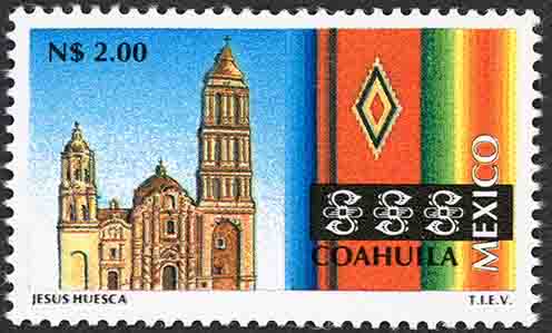 No. Scott: 1791 -- Año de Emisión: 1995 -- Valor Facial: N$ 2.00 -- Multicolor -- Perforación: 14 x 14 1/4 -- Tipo de Impresión: Huecograbado Timbre Postal Mexicano multicolor, perteneciente a la serie de México Turístico, del lado izquierdo de la imagen aparece la fachada de la catedral de Saltillo y del lado derecho se aprecia un textil artesanal de varios colores, sobre la estampilla está escrito el valor facial de "N$ 2.00", "COAHUILA MÉXICO" y "JESÚS HUESCA T.I.E.V.". Para más información favor de dirigirse a biblioteca@mufi.org.mx
