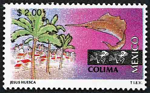 No. Scott: 1792 -- Año de Emisión: 1993 -- Valor Facial: N$ 2.00 -- Multicolor -- Perforación: 14 x 14 1/4 -- Tipo de Impresión: Huecograbado Timbre Postal Mexicano multicolor, perteneciente a la serie de México Turístico, del lado izquierdo se observa una área habitacional y tres palmeras al frente, del lado derecho aparece un pez espada de gran tamaño, caracterizado por su pico largo y aplanado, sobre la imagen está escrito el valor facial de "N$ 2.00", "COLIMA, MEXICO" y JESÚS HUESCA, T.I.E.V. Para más información favor de dirigirse a biblioteca@mufi.org.mx