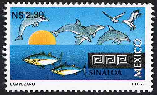 No. Scott: 1794 -- Año de Emisión: 1993 -- Valor Facial: $ 2.30 -- Multicolor -- Perforación: 14 x 14 1/4 -- Tipo de Impresión: Huecograbado Timbre Postal Mexicano multicolor, perteneciente a la serie de México Turístico, en forma surrealista, la imagen nos proyecta el cielo, el mar y el sol, en la parte frontal aparecen animales mamíferos marinos, conocidos como delfines y algunas aves en vuelo, en la parte superior aparece escrito el valor facial de "$ 2.30", en la parte inferior "SINALOA, MEXICO" y "CAMPUZANO T.I.E.V.". Para más información favor de dirigirse a biblioteca@mufi.org.mx