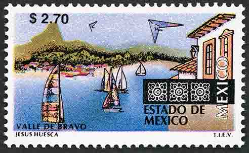 No. Scott: 1797 -- Año de Emisión: 1993 -- Valor Facial: N$ 2..70 -- Multicolor -- Perforación: 14 x 14 1/4 -- Tipo de Impresión: Huecograbado Timbre Postal Mexicano multicolor, perteneciente a la serie de México Turístico, al fondo de la imagen se aprecian montañas con mucha vegetación, al frente hay una gran extensión de agua y sobre de ésta, algunas velas de mar, del lado derecho, aparece una casa con grandes ventanales y techo de teja, en la parte superior está escrito el valor facial de "N$ 2.70", en la parte inferior "ESTADO DE MEXICO", "VALLE DE BRAVO" y "JESÚS HUESCA T.I.E.V.". Para más información favor de dirigirse a biblioteca@mufi.org.mx