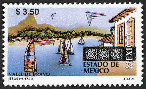 No. Scott: 1970 -- Año de Emisión: 1997 -- Valor Facial: $ 3..50 -- Multicolor -- Perforación: 14 x 14 1/4 -- Tipo de Impresión: Huecograbado Timbre Postal Mexicano multicolor, perteneciente a la serie de México Turístico, al fondo de la imagen se aprecian montañas con mucha vegetación, al frente hay una gran extensión de agua y sobre de ésta, algunas velas de mar, del lado derecho, aparece una casa con grandes ventanales y techo de teja, en la parte superior está escrito el valor facial de "N$ 3.50", en la parte inferior "ESTADO DE MEXICO", "VALLE DE BRAVO" y "JESÚS HUESCA T.I.E.V.". Para más información favor de dirigirse a biblioteca@mufi.org.mx