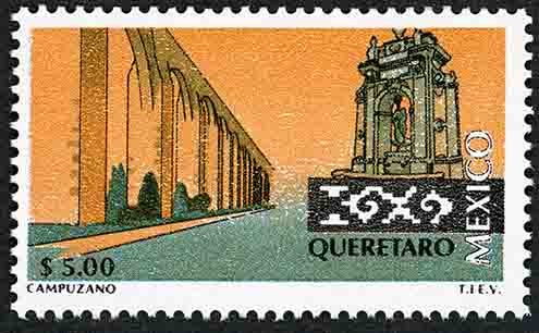 No. Scott: 1975 -- Año de Emisión: 1997 -- Valor Facial: $ 7.00 -- Multicolor -- Perforación: 14 x 14 1/4 -- Tipo de Impresión: Huecograbado Timbre Postal Mexicano multicolor, perteneciente a la serie de México Turístico, en forma surrealista y del lado izquierdo de la imagen aparece un edificio monumental con arcos y un poco de vegetación, del lado derecho se observa un monumento histórico, sobre la estampilla está escrito el valor facial de "N$ 7.00", "QUERÉTARO, MÉXICO" y "CAMPUZANO T.I.E.V.". Para más información favor de dirigirse a biblioteca@mufi.org.mx