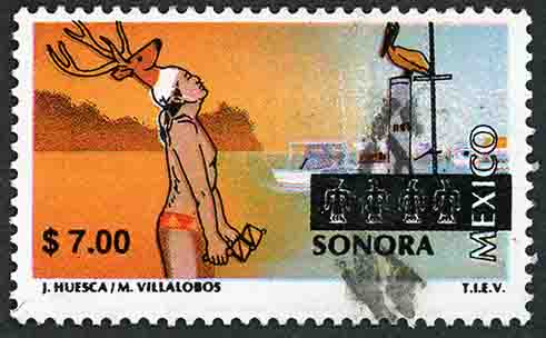 No. Scott: 1979 -- Año de Emisión: 1993 -- Valor Facial: $ 7.00 -- Multicolor -- Perforación: 14 x 14 1/4 -- Tipo de Impresión: Huecograbado Timbre Postal Mexicano multicolor, perteneciente a la serie de México Turístico, en forma surrealista aparecen dos paisajes, del lado izquierdo hay un personaje semidesnudo, portando un taparrabo, sobre su cabeza, lleva una cabeza disecada de venado con grandes cuernos y una maraca en cada mano, del lado derecho, se observa una imagen acuática, con barcos y un ave, sobre la estampilla está escrito el valor facial de "$ 7.00", "SONORA, MEXICO y "J. HUESCA / M. VILLALOBOS T.I.E.V." Para más información favor de dirigirse a biblioteca@mufi.org.mx