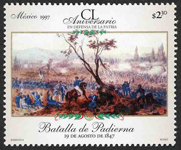 No. Scott: 2045 -- Año de Emisión: 1997 -- Valor Facial: $ 2.30 -- Multicolor -- Perforación: 13 1/4 x 13 1/2 -- Tipo de Impresión: Offset Flourescente Timbre Postal Mexicano multicolor, en él aparece una imagen de la Batalla de Padierna, la cual se liberó el 19 de agosto de 1847 y culminó el 20 del mismo mes y año, en la ciudad de México, en la parte superior está escrito "México 1997", "CL Aniversario EN DEFENSA DE LA PATRIA", el valor facial de "$2.30" y en la parte inferior "Batalla de Padierna", "19 DE AGOSTO DE 1847", "BARRANCA, ROMO". Para más información favor de dirigirse a biblioteca@mufi.org.mx