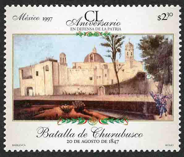 No. Scott: 2046 -- Año de Emisión: 1997 -- Valor Facial: $ 2.30 -- Multicolor -- Perforación: 13 1/4 x 13 1/2 -- Tipo de Impresión: Offset Flourescente Timbre Postal Mexicano multicolor, en él aparece una imagen de la Batalla de Churubusco, la cual se llevó a cabo el 20 de agosto de 1847 y formó parte de la intervención estadounidense en México, en la parte superior está escrito "México 1997", "CL Aniversario EN DEFENSA DE LA PATRIA", el valor facial de "$2.30" y en la parte inferior "Batalla de "Churubusco", "20 DE AGOSTO DE 1847", "BARRANCA, ROMO". Para más información favor de dirigirse a biblioteca@mufi.org.mx