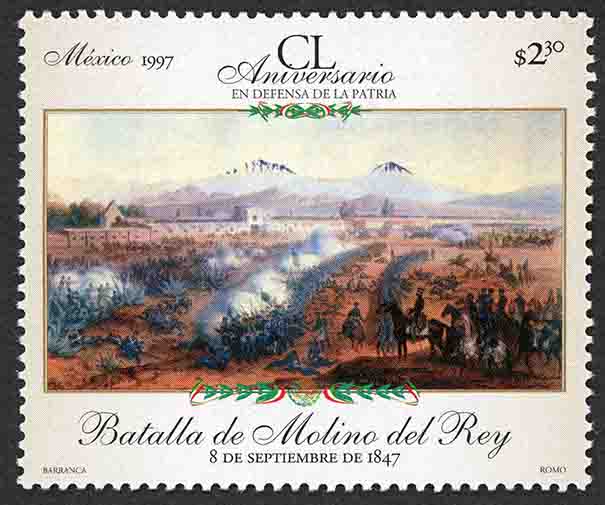 No. Scott: 2047 -- Año de Emisión: 1997 -- Valor Facial: $ 2.30 -- Multicolor -- Perforación: 13 1/4 x 13 1/2 -- Tipo de Impresión: Offset FlourescenteTimbre Postal Mexicano multicolor, en él aparece una imagen de la Batalla de Molino del Rey, la cual se llevó a cabo el 08 de Septiembre de 1847 , en la que hubo un enfrentamiento entre el ejército estadounidense y ejército mexicano en las inmediaciones de la Ciudad de México,en la parte superior está escrito "México 1997", "CL Aniversario EN DEFENSA DE LA PATRIA", el valor facial de "$2.30" y en la parte inferior "Batalla deL Molino", "08 DE SEPTIEMBRE DE 1847", "BARRANCA, ROMO".