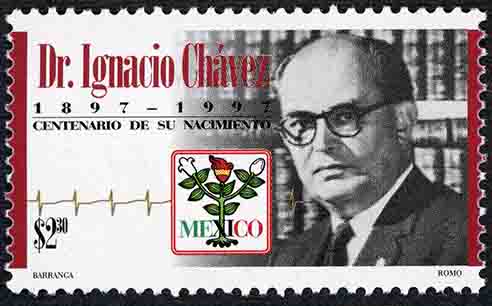 No. Scott: 2031 -- Año de Emisión: 1997 -- Valor Facial: $ 2.30 -- Multicolor -- Perforación: 13 1/2 x 13 1/4 -- Tipo de Impresión: Offset Flourescente Timbre Postal Mexicano multicolor, en la imagen aparece el retrato del médico cardiólogo Ignacio Chávez Sánchez, a un costado la representación gráfica de la actividad eléctrica del corazón y un logotipo del Instituto de Cardiológia, sobre la estampilla está escrito "Dr. Ignacio Chavez 1897-1997, CENTENARIO DE SU NACIMIENTO", el valor facial de "$2.30" y "BARRANCA, ROMO". Para más información favor de dirigirse a biblioteca@mufi.org.mx