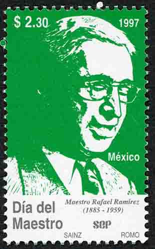 No. Scott: 2034 -- Año de Emisión: 1997 -- Valor Facial: $ 2.30 -- Multicolor -- Perforación: 13 1/2 -- Tipo de Impresión: Offset Flourescente Timbre Postal Mexicano en colores verde y negro, en la imagen aparece el retrato del Profesor Rafael Ramírez Castañeda, en la parte superior está escrito el valor facial de "$2.30", "1997", "MÉXICO", "Día del Maestro", "SEP" y "SAINZ, ROMO". Para más información favor de dirigirse a biblioteca@mufi.org.mx