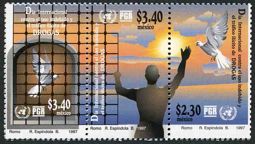No. Scott: 2037 -- Año de Emisión: 1997 -- Valor Facial: $ 3.40, $ 2.30 -- Multicolor -- Perforación: 13 1/2 -- Tipo de Impresión: Offset FlourescenteTira de Tres Timbres Mexicanos Se-tenant multicolor, en la primera estampilla se observa una paloma en un ventanal y detrás de una reja, en la segunda un hombre en libertad y en la tercera una paloma en vuelo, en cada timbre está escrito "Día Internacional contra el uso indebido y el tráfico ilícito de DROGAS", el valor facial, "MEXICO", "PGR" y "Romo, R. Espíndola B. 1997".