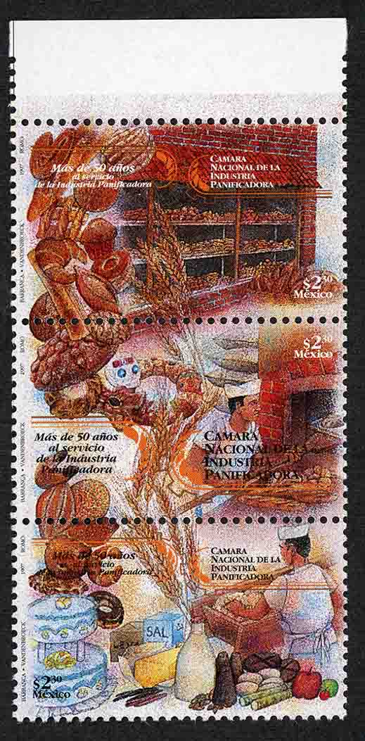 No. Scott: 2061 -- Año de Emisión: 1997 -- Valor Facial: $ 2.30 -- Multicolor -- Perforación: 13 1/2 -- Tipo de Impresión: Offset FlourescenteTira Vertical de Tres Timbres Postales Mexicanos multicolor, alusivos a la industra panificadora, en el primer timbre se observa un expendipo de pan, en el segundo un horno de cocimiento y en el tercero los ingredientes que se utilizan para la elaboración, sobre las estampillas está escrito el valor facial de "$ 2.30", "México", "Más de 50 años al servicio de la industria panificadora y "CÁMARA NACIONAL DE LA INDUSTRIA PANIFICADORA".