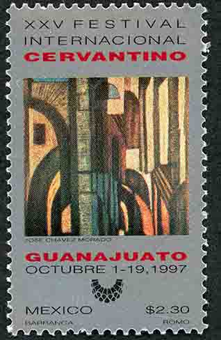 No. Scott: 2062 -- Año de Emisión: 1997 -- Valor Facial: $ 2.30 -- Multicolor -- Perforación: 13 1/2 -- Tipo de Impresión: Offset Flourescente Timbre Postal Mexicano multicolor, en la imagen aparece una pequeña parte de la pintura realizada por José Chávez Morado, titulado "Las Calles de guanajuato", en la parte superior está escrito "XXV FESTIVAL INTERNACIONAL CERVANTINO", en la parte inferior "GUANAJUATO OCTYBRE 1-19, 1997", "MÉXICO" y el valor facial de "$ 2.30". Para más información favor de dirigirse a biblioteca@mufi.org.mx