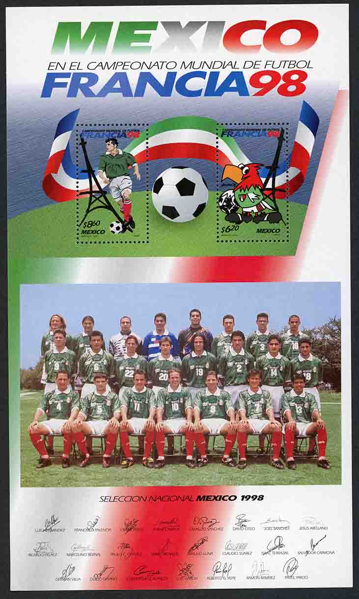 No. Scott: 2069 -- Año de Emisión: 1998 -- Valor Facial: $ 8.60 y $ 6.20 -- Multicolor -- Perforación: 13 1/2 -- Tipo de Impresión: Offset FlourescenteHoja Recuerdo con dos Timbres de México en varios colores, en la parte superior aparecen dos timbres, en el primero se observa a un jugador de futbol, con un balón en los pies, en el segundo está la mascota de México, representada por un águila, en la parte inferior aparece una fotografía de la Selección Nacional de México 1998 y los autógrafos de los jugadores, sobre la estampilla está escrito "MÉXICO EN EL CAMPEONATO MUNDIAL DE FUTBOL FRANCIA 98", los valores faciales de "$ 8.60 y 6.20", "MÉXICO" y "SELECCIÓN NACIONAL MÉXICO 1998".