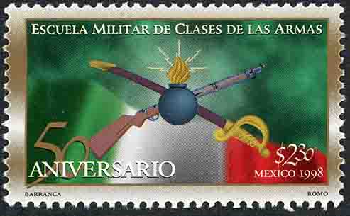 No. Scott: 2064 -- Año de Emisión: 1998 -- Valor Facial: $ 2.30 -- Multicolor -- Perforación: 14 -- Tipo de Impresión: Offset Flourescente Timbre Postal Mexicano multicolor, en la imagen aparece el Escudo de Armas de la Escuela Militar, representada por una espada y un rifle cruzados, en el centro se observa un proyectil explosivo, en la parte superior está escrito "ESCUELA MILITAR DE CLASES DE ARMAS", en laparte inferior "50 ANIVERSARIO", el valor facial de "$ 2.30", "MÉXICO 1998" y "BARRANCA, ROMO". Para más información favor de dirigirse a biblioteca@mufi.org.mx