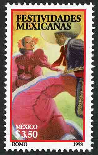 No. Scott: 2066 -- Año de Emisión: 1998 -- Valor Facial: $ 3.50 -- Multicolor -- Perforación: 13 1/4 -- Tipo de Impresión: Offset Flourescente Timbre Postal Mexicano multicolor, en la imagen aparece una pareja de bailarines, mujer y hombre, ambos estan vestidos con trajes regionales, la chica porta un vestido con olanes y mangas pomposas, con adornos coloridos en la cabeza, el chico porta un traje de charro en color negro y sombrero, sobre la estampilla está escrito "FESTIVIDADES MEXICANAS ", "MÉXICO", el valor facial de "$ 3.50" y "ROMO 1998". Para más información favor de dirigirse a biblioteca@mufi.org.mx