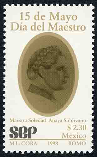 No. Scott: 2074 -- Año de Emisión: 1998 -- Valor Facial: $ 2.30 -- Multicolor -- Perforación: 13 1/2 -- Tipo de Impresión: Offset Flourescente Timbre Postal Mexicano en colores oro y negro, en la imagen se observa un óvalo en color oro y dentro de él aparece el retrato de la profesora y literata mexicana Soledad Anaya Solórzano, en la parte superior está escrito "15 de Mayo, Día del Maestro", en la parte inferior "Maestra Soledad Anaya Solórzanao", el valor facial de "$ 2.30", "SEP", "MÉXICO" y "M. L. CORA, 1998, ROMO". Para más información favor de dirigirse a biblioteca@mufi.org.mx
