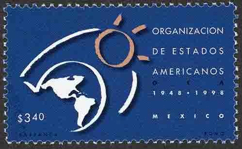 No. Scott: 2072 -- Año de Emisión: 1998 -- Valor Facial: $ 3.40 -- Multicolor -- Perforación: 13 1/2 -- Tipo de Impresión: Offset Flourescente Timbre Postal Mexicano multicolor, en la imagen aparece una ilustración minimalista, en donde se observa el mapa de América, el sol y el número "50", sobre la estampilla está escrito "ORGANIZACIÓN DE ESTADOS AMERICANOS", "OEA", "1948-1998", "MÉXICO" y el valor fcial de "$ 3.40". Para más información favor de dirigirse a biblioteca@mufi.org.mx