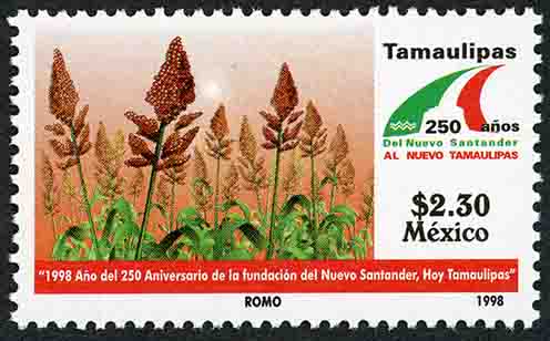 No. Scott: 2075 -- Año de Emisión: 1998 -- Valor Facial: $ 2.30 -- Multicolor -- Perforación: 13 1/2 -- Tipo de Impresión: Offset Flourescente Timbre Postal Mexicano multicolor, en la imagen se observa un sembradío de plantas con tallo largo, hojas alargadas y espigas, del lado derecho de la estampilla está escrito "Tamaulipas", "250 Años sdel Nuevo Santander AL NUEVO TAMAULIPAS", el valor facial de "$2.30", "MÉXICO", en la parte inferior "1998 Año del 250 Aniversario de la Fundación del Nuevo Santander, Hoy Tamaulipas" y "ROMO 1998". Para más información favor de dirigirse a biblioteca@mufi.org.mx