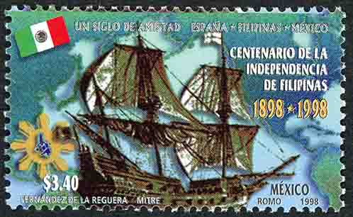 No. Scott: 2079 -- Año de Emisión: 1998 -- Valor Facial: $ 3.40 -- Multicolor -- Perforación: 13 1/2 -- Tipo de Impresión: Offset Flourescente Timbre Postal Mexicano multicolor, en la imagen se observa la Bandera Nacional de México, también aparece un barco de gran tamaño, más corto y ancho que una galera, con tres palos y velas de cruz, sobre la estampilla está escrito "UN SIGLO DE AMISTAD ESPAÑA, FILIPINAS, MÉXICO", "CENTENARIO DE LA INDEPENDENCIA DE FILIPINAS 1898-1998", el valor facial de "$3.40", "MÉXICO" y "FERNÁNDEZ DE LA REGUERA, MITRE, ROMO, 1998". Para más información favor de dirigirse a biblioteca@mufi.org.mx