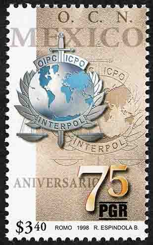 No. Scott: 2094 -- Año de Emisión: 1998 -- Valor Facial: $ 3.40 -- Multicolor -- Perforación: 13 1/2 -- Tipo de Impresión: Offset Flourescente Timbre Postal Mexicano multicolor, en la imagen aparece el emblema de la Interpol en tercera dimensión, en él aparece una balanza, que es el símbolode la justicia, una espada en posición vertical, símbolo de la acción policial, el nombre I"NTERPOL" y las siglas "ICPO", "OIPC", sobre la estampilla está escrito "O.C.N. MÉXICO", "75 ANIVERSARIO, PGR" el valor facial de "$3.40" y "ROMO, 1998, R. ESPÍNDOLA B.". Para más información favor de dirigirse a biblioteca@mufi.org.mx