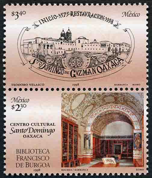 No. Scott: 2089a-b -- Año de Emisión: 1998 -- Valor Facial: $ 3.40 y 2.30 -- Multicolor -- Perforación: 13 1/2 -- Tipo de Impresión: Offset FlourescenteDos Timbres Postales de México en varios colores, en el primero aparece la fachada del Convento de Santo Domingo de Guzmán, en él aparece escrito el valor facial de "$3.40", "MÉXICO", "INICIO-1575-RESTAURACIÓN 1998", en el segundo se aprecia una pequeña parte de la Biblioteca Francisco de Burgoa, del lado derecho está escrito "MÉXICO", el valor facial de "$2.30", "CENTRO CULTURAL Santo Domingo OAXACA", "BIBLIOTECA FRANCISCO DE BURGOA" y "1998, KOCHEN / BARRANCA, ROMO".