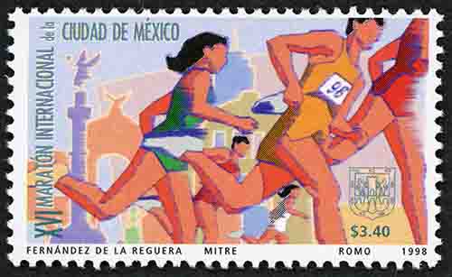 No. Scott: 2091 -- Año de Emisión: 1998 -- Valor Facial: $ 3.40 -- Multicolor -- Perforación: 13 1/2 -- Tipo de Impresión: Offset Flourescente Timbre Postal Mexicano multicolor, al fondo de la imgen se aprecia una zona urbana con varios edificios, en primer plano se obserban a varios deportistas en movimiento, al parecer van corriendo, ellos están vestidos con shorts y camisetas, sobre la estampilla está escrito "XVI MARATÓN INTERNACIONAL de la CIUDAD DE MÉXICO", el valor facial de "$3.40" y "FERNÁNDEZ DE LA REGUERA, MITRE, ROMO, 1998". Para más información favor de dirigirse a biblioteca@mufi.org.mx
