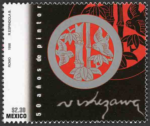 No. Scott: 2096 -- Año de Emisión: 1998 -- Valor Facial: $ 2.30 -- Multicolor -- Perforación: 13 1/2 -- Tipo de Impresión: Offset Flourescente Timbre Postal mexicano multicolor, en la imagen aparece una obra del pintor, ceramista, muralista y escultor mexicano Luis Nishizawa, titulada El Mon de la familia Nishizawa, sobre la estampilla está escrito "50 años de pintor Nishizawa", el valor facial de "$2.30", "MÉXICO" y ROMO, 1998, R. ESPÍNDOLA B." Para más información favor de dirigirse a biblioteca@mufi.org.mx