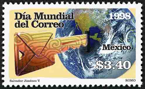 No. Scott: 2097 -- Año de Emisión: 1998 -- Valor Facial: $ 3.40 -- Multicolor -- Perforación: 13 1/2 -- Tipo de Impresión: Offset Flourescente Timbre Postal Mexicano multicolor, al fondo de la imagen aparece la figura del mundo resaltándo parte del Continente Americano, al frente, se observa una llave en forma de carta, sobre la imagen está escrito "Día Mundial del Correo", "1998", "MÉXICO", el valor facial de "$3.40" y "Salvador Jiménez V", ROMO". Para más información favor de dirigirse a biblioteca@mufi.org.mx