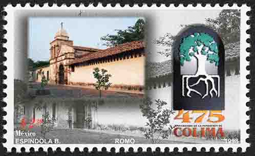 No. Scott: 2106 -- Año de Emisión: 1998 -- Valor Facial: $ 2.30 -- Multicolor -- Perforación: 13 1/2 -- Tipo de Impresión: Offset FlourescenteTimbre Postal Mexicano multicolor, en la imagen se observa un paisaje rural, en él aparece la fachada de una casa antigua de gran tamaño, con algunos árboles por dentro, al frente hay un charco de agua que permite reflejar parte de la entrada de la casa, del lado derecho y en forma sobresaliente se observa el escudo nacional de la Ciudad de Colima, en la parte inferior está escrito el valor facial de "$2.30", "MÉXICO", "475 ANIVERSARIO DE LA FUNDACIÓN DE LA CIUDAD DE COLIMA" y "ESPÍNDOLA B., ROMO, 1998".