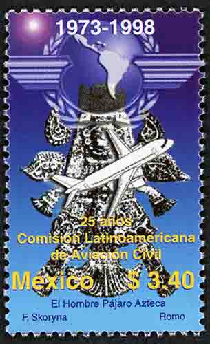 No. Scott: 2109 -- Año de Emisión: 1998 -- Valor Facial: $3.40 -- Multicolor -- Perforación: 1 1/2 -- Tipo de Impresión: Offset Flourescente Timbre Postal mexicano multicolor, al fondo de la imagen se observa una figura prehispánica en forma de hombre y pájaro, al frente aparece un avión en vuelo, sobre la estampilla está escrito "1973-1998", en la parte inferior "25 años Comisión Latinoamericana de Aviación Civil", "MÉXICO", el valor facial de "$3.40", "El Hombre Pájaro Azteca" y "F. Skoryna, ROMO". Para más información favor de dirigirse a biblioteca@mufi.org.mx