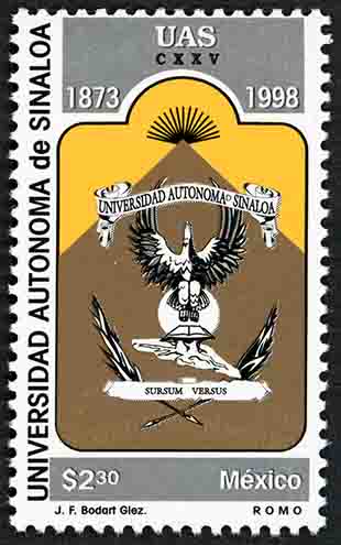 No. Scott: 2112 -- Año de Emisión: 1998 -- Valor Facial: $2.30 -- Multicolor -- Perforación: 13 -- Tipo de Impresión: Offset Flourescente Timbre Postal Mexicano multicolor, en la imagen aparece el emblema de la Univversidad Autónoma de Sinaloa, en el cual aparece un águila, que es la característica distintiva de la institución, un listón UAS que significa autonomía, un sol naciente, mismo que representa vigor, calor, energía y fertilidad, en ñla parte superior está escrito "UAS CXXV 1873-1998", el valor facial de "$2.30", "MÉXICO", "UNIVERSIDAD AUTÓNOMA DE SINALOA" y J.F. BODART GLEZ, ROMO". Para más información favor de dirigirse a biblioteca@mufi.org.mx