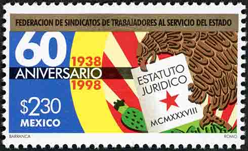No. Scott: 2111 -- Año de Emisión: 1998 -- Valor Facial: $2.30 -- Multicolor -- Perforación: 13 -- Tipo de Impresión: Offset FlourescenteTimbre Postal Mexicano multicolor, en el fondo se observa un mozaico multicolor elaborado con líneas rectas y curvas, al frente hay un águila parada sobre un nopal y sosteniendo en su pico, un documento que dice "ESTATUTO JURÍDICO MCMXXXVIII", sobre la estampilla está escrito, "FEDERACIÓN DE SINDICATOS DE TRABAJADORES AL SERVICIO DEL ESTADO", "60 ANIVERSARIO 1938-1998", el valor facial de "$2.30" y "MÉXICO".